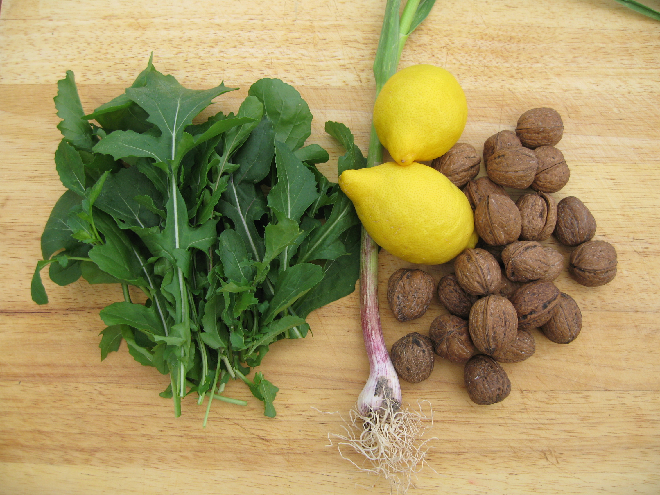 This recipe combines the peppery flavour of rocket with the sweetness of roasted walnuts and the acid of fresh lemon juice, but you can also make a more oriental version with fresh coriander, lemon grass and lime bound together with either sesame oil or olive oil. These sauces will keep up to ten days in the fridge, but if you pack the paste into sterilised jars making sure that there are no air bubbles and then pour at least one centimeter of oil on it to create a seal, it will keep for several months if stored in a cool dark place.