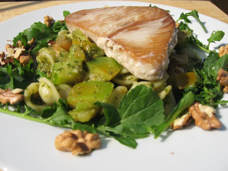 Thats it. This pesto goes particularly well with fish and that is what I am having it with today. I’ve used it as a sauce on the pasta shells to accompany a piece of grilled tuna.
