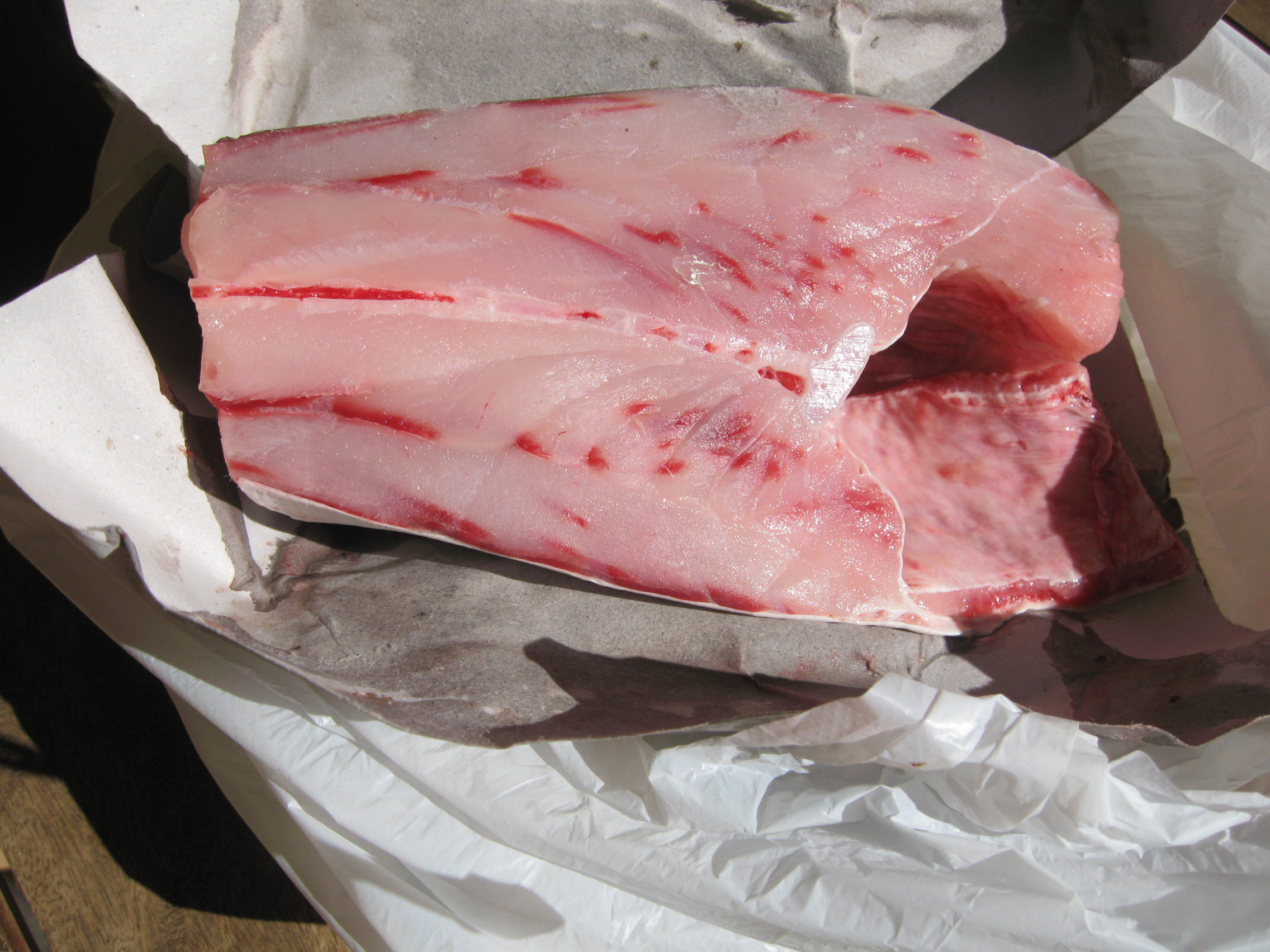 120 gms fish per person – a meaty white fish such as swordfish or shark.