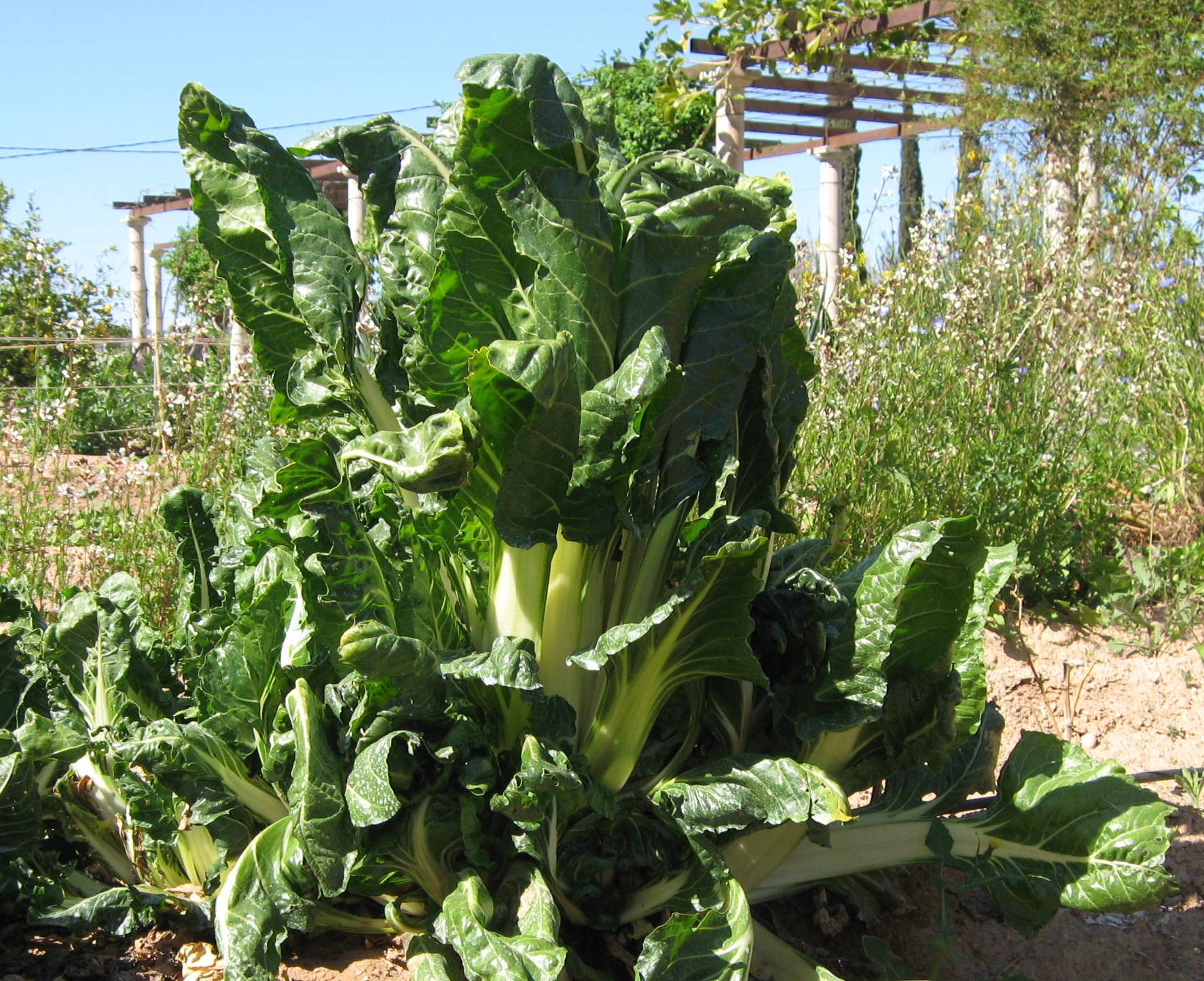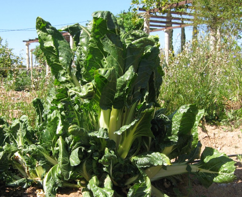 Chard, or Acelgas in spanish, is grown in this part of spain in place of spinach. It suits much better the soil and the climate here. For the home grower it has the advantage of cropping over a very long period, in fact the plants that I am trimming for this recipe were planted a year ago. This recipe is incredibly simple, but the sum of the flavours is greater than the parts.