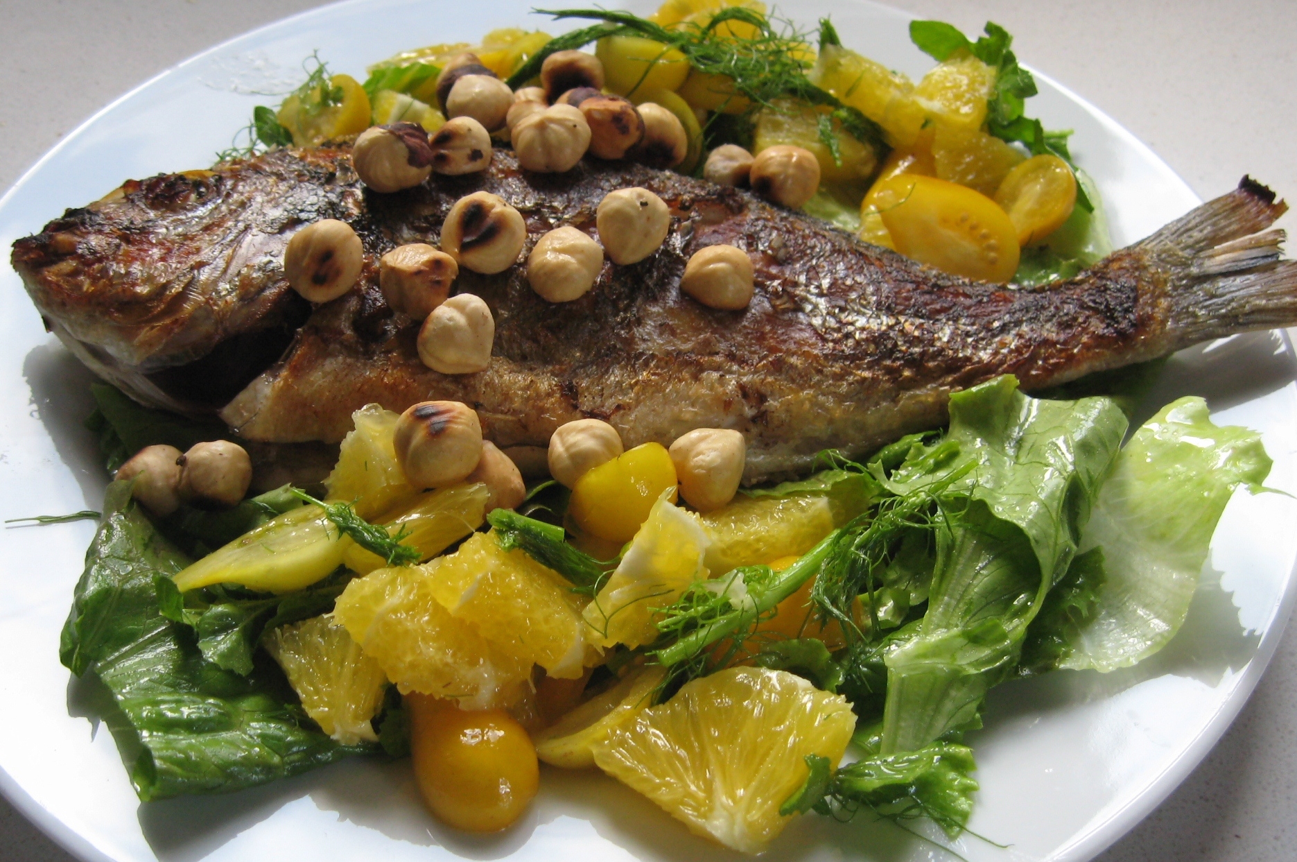 With my Dorada this week I made a salad of oranges, yellow plum tomatoes, fennel fronds, crunchy lettuce leaves and toasted hazel nuts, all dressed with some of the Sicilian olive oil.