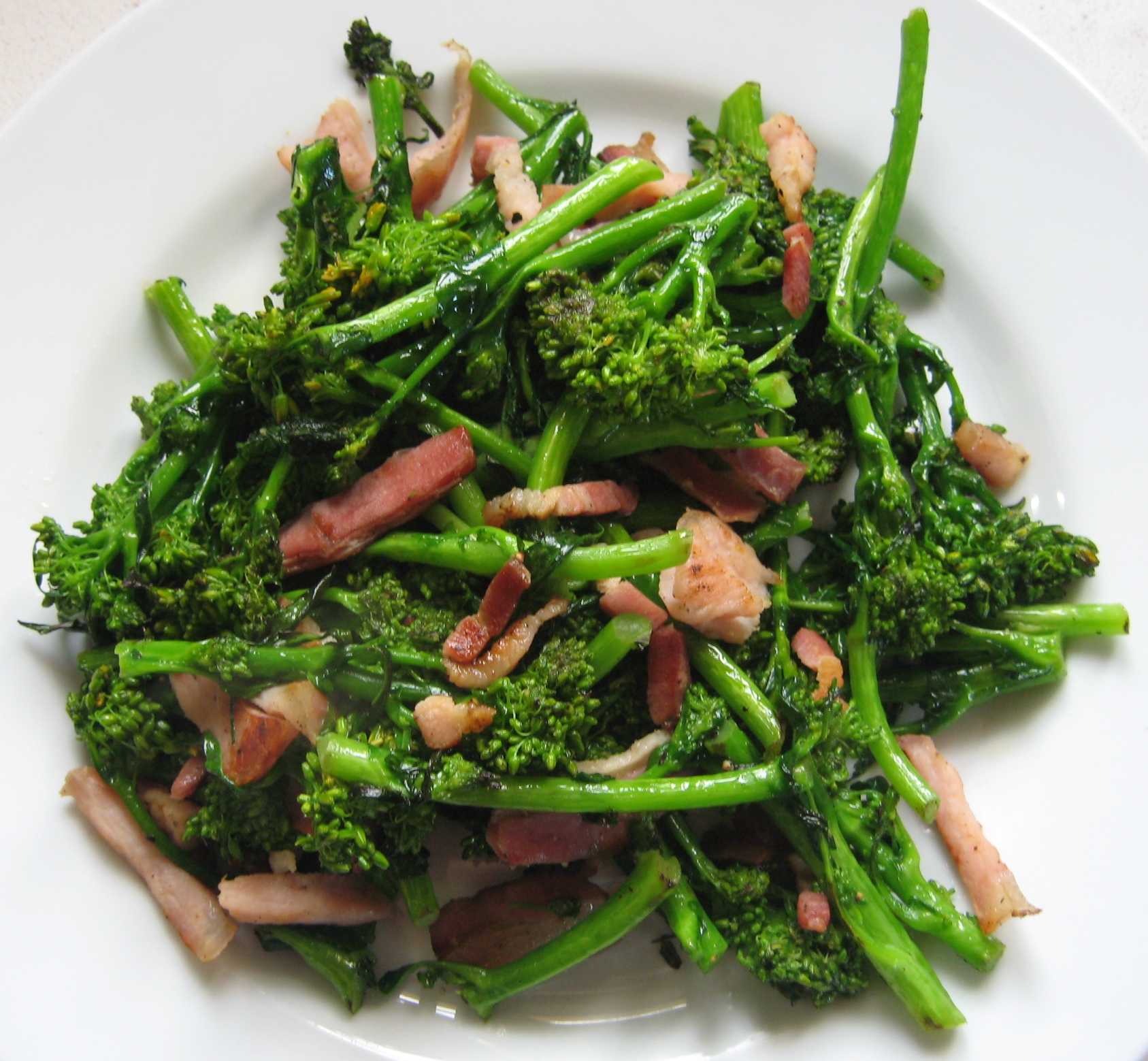 Add florets of Cima or broccoli. Toss with thee bacon and olive oil.