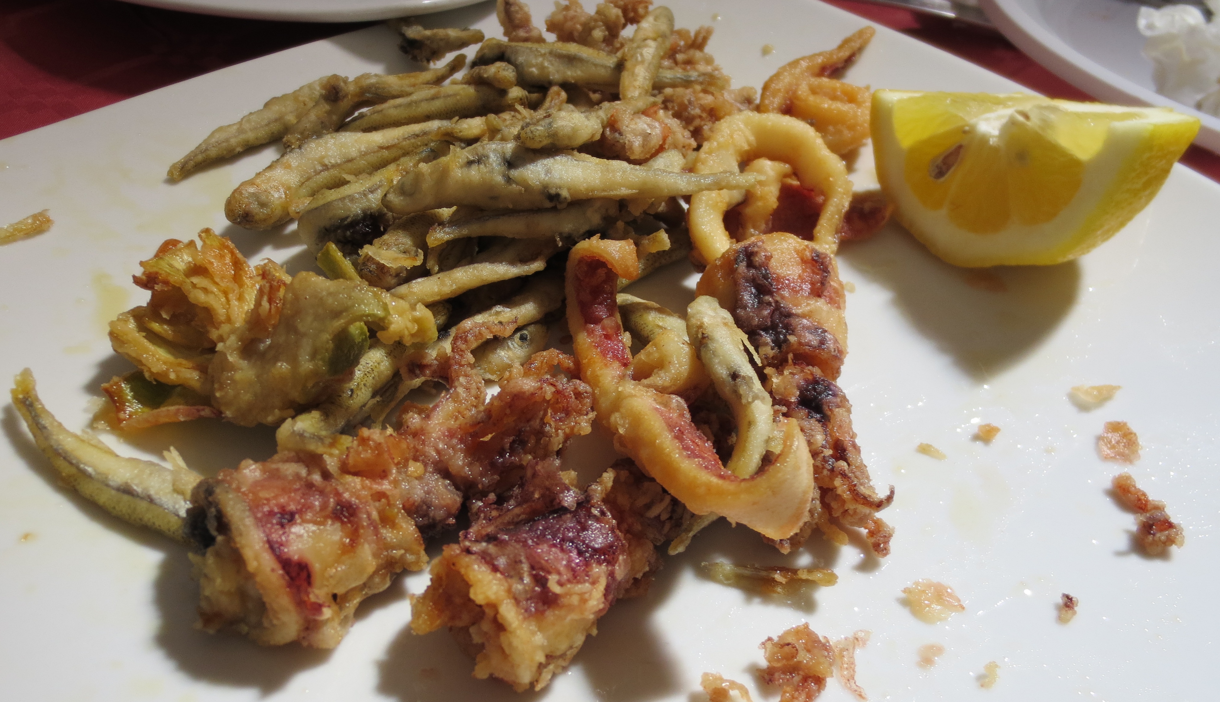 IMG_0171 IMG_0153 IMG_0156 IMG_0157 IMG_0158 IMG_0160 IMG_0161     We found this fantastic stall where workmen were ordering butties filled with fried fish as a mid morning snack, and before we knew it had been persuaded into a sample plate of their dishes. Whitebait and Squid in crispy batter, Artichoke quarters and Aubergine slices dusted with flour and deep fried, a battered rectangle with a soft centre which turned out to be made from chickpea flour and fluffy potato and fish croquettes. All served with crispy yellow bread and local wine.