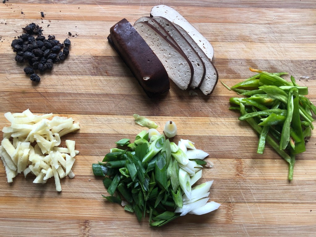 I’m something of a novice with tofu dishes, especially the smoked type, so this dish was a bit make it up as you go along, hence the black beans appearing in the photo of ingredients, which I decided not to use. This tofu has a delicate flavour, not of smoke exactly, more fragrant like a very lightly smoked tea, so it felt right to complement the delicate taste of the tofu rather than adding strong flavours.