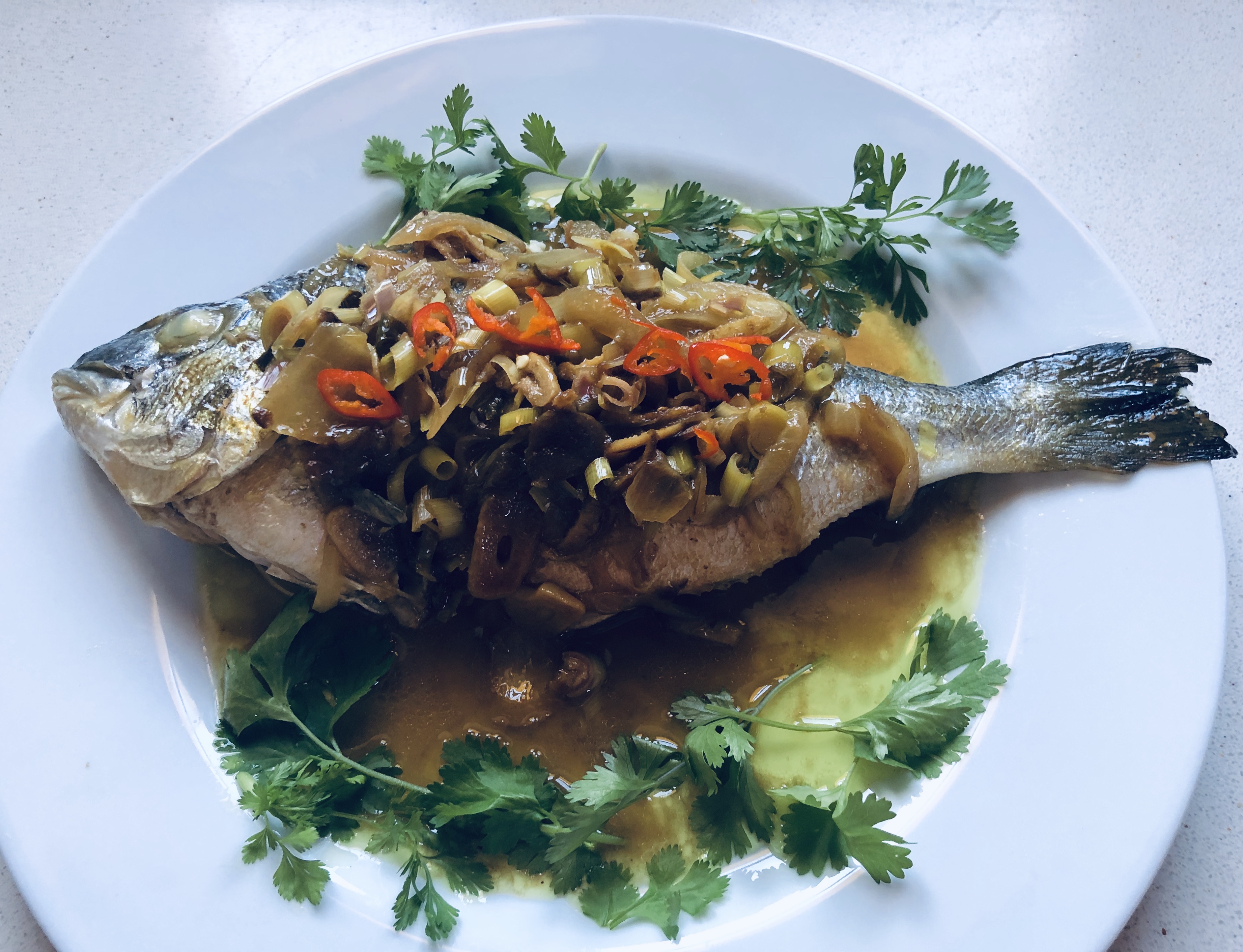 To follow the oriental them of the rice noodles I flavour the fish with slivers of garlic, ginger, chilli and lemongrass and use coconut milk as the liquid.