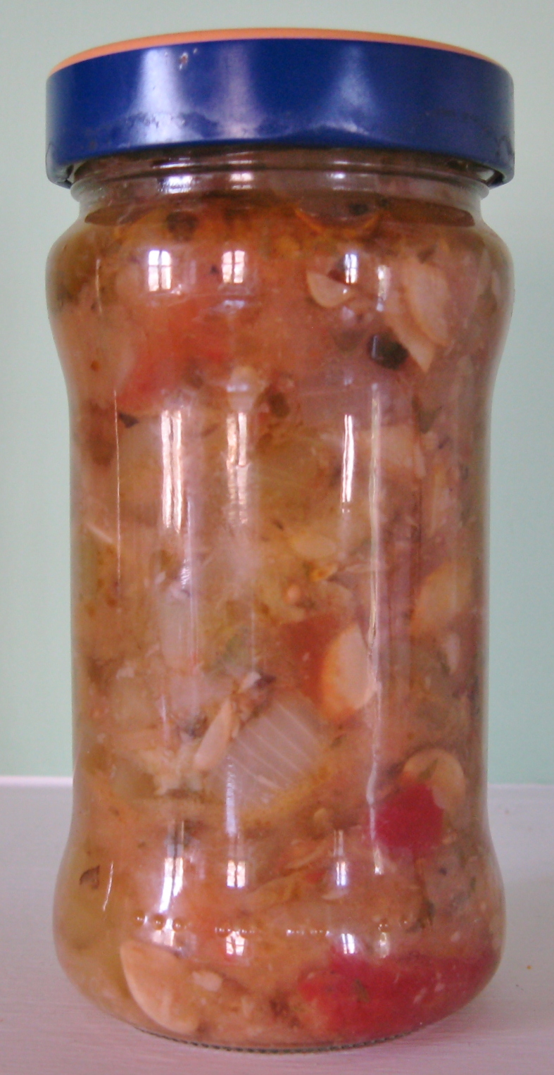 Essential equipment for these recipes are jars. I find that as these salads are quite rich containing a large proportion of olive oil I don’t want to use a large amount at once, so save any small jars that come into the house. They need to have a screw top and plastic seal as so many modern jars do. They need to be scrupulously clean and then need sterilizing in a water bath just before use. Don’t be put off by the terminology, they just need to be put in a pan of boiling water with their lids and held there for five minutes.