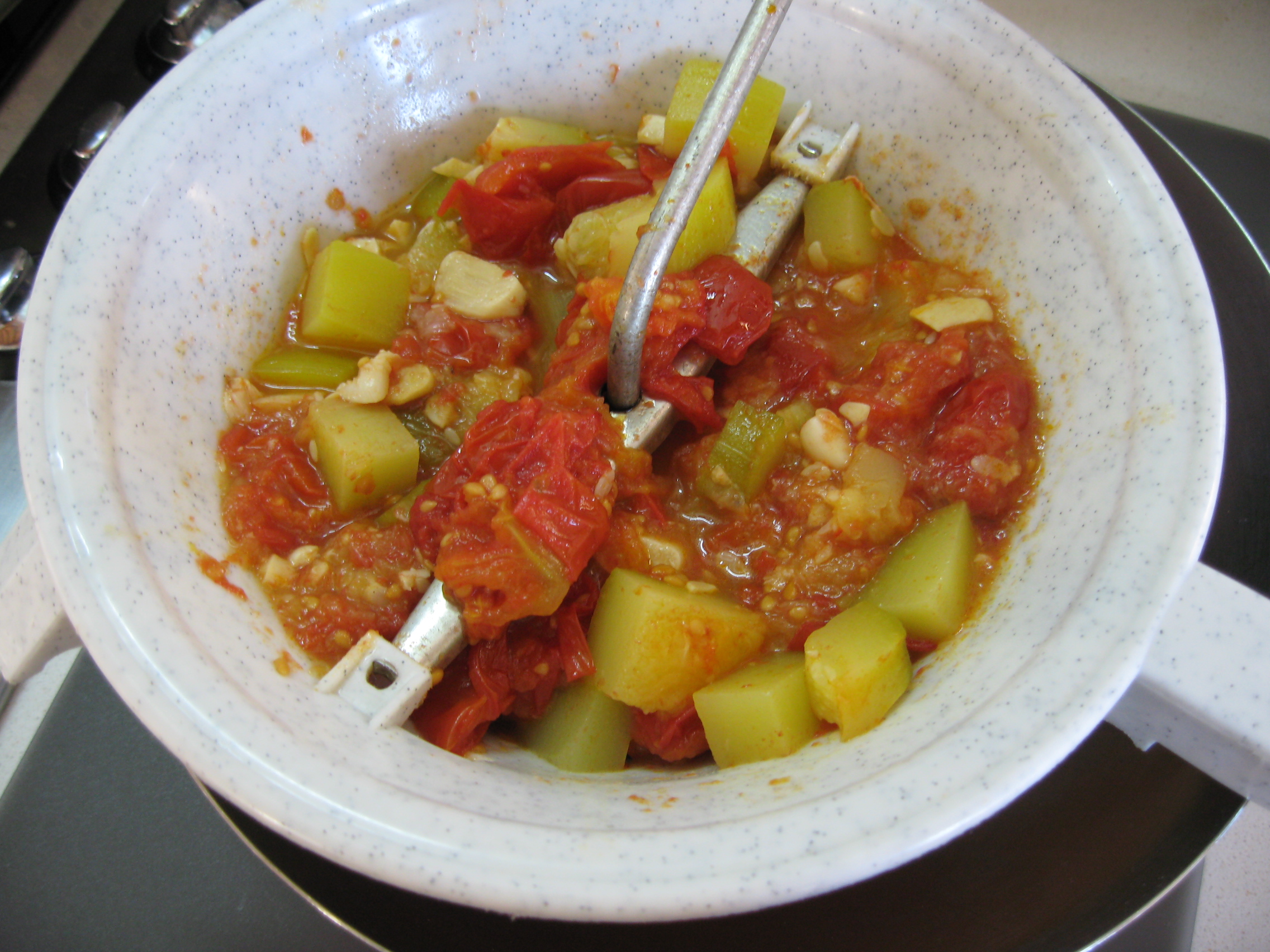 Courgette Salad – I made this after returning from a short trip to find that my courgettes had turned into mini-marrows while I was away. Courgettes, peeled and diced, onion chopped small, garlic as above and a couple of peeled and chopped tomatoes. Follow the master recipe above for the method.