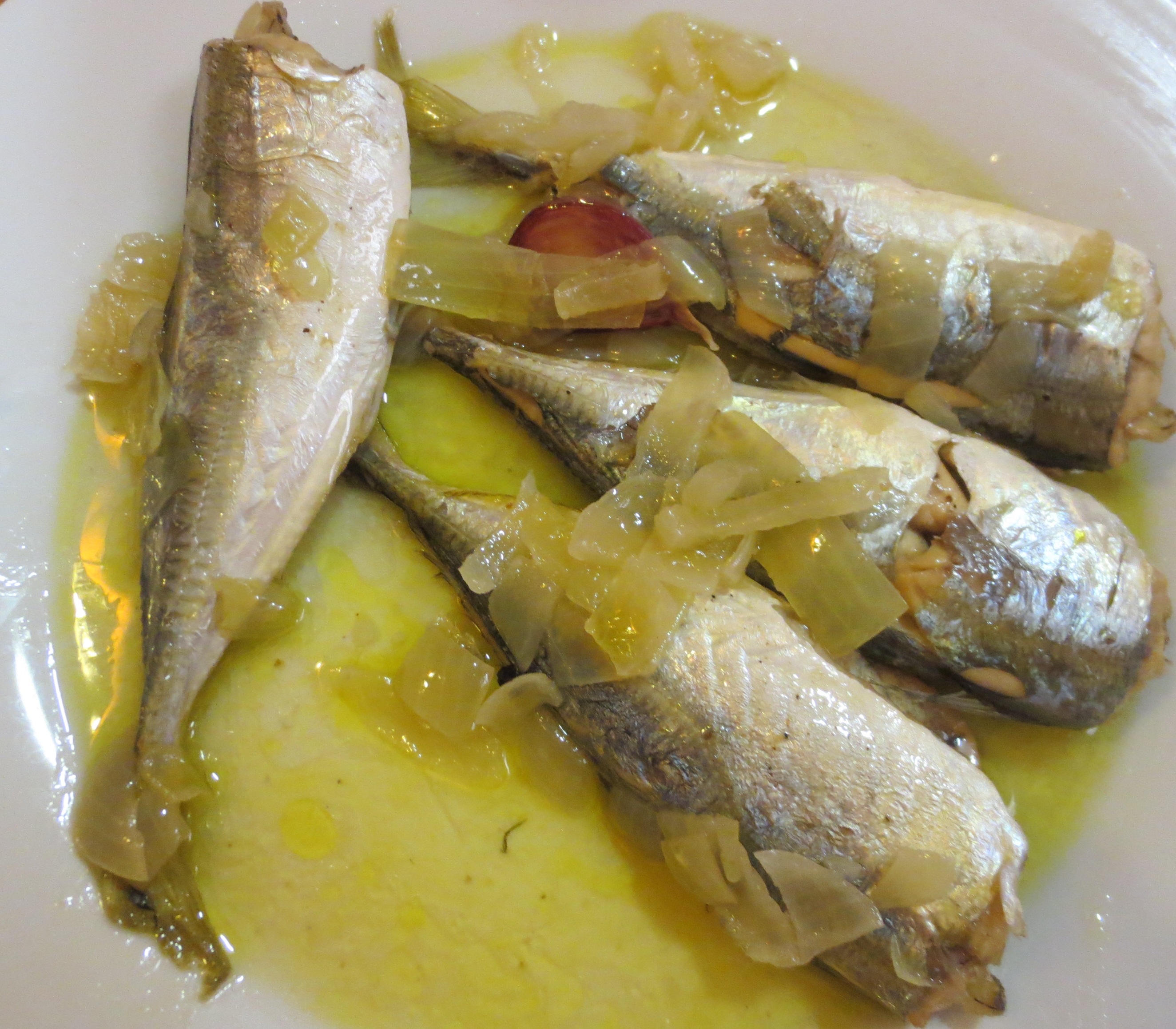 Jureles en Escabeche. Escabeche is a way of mildly pickling fish. It is gently poached in a broth of olive oil, white wine vinegar and water which is flavoured with onions, peppercorns, saffron and bayleaves. Frequently smoky Pimenton is added as well, but in this dish of small fish it wasn’t needed.