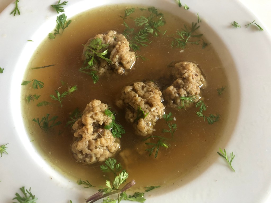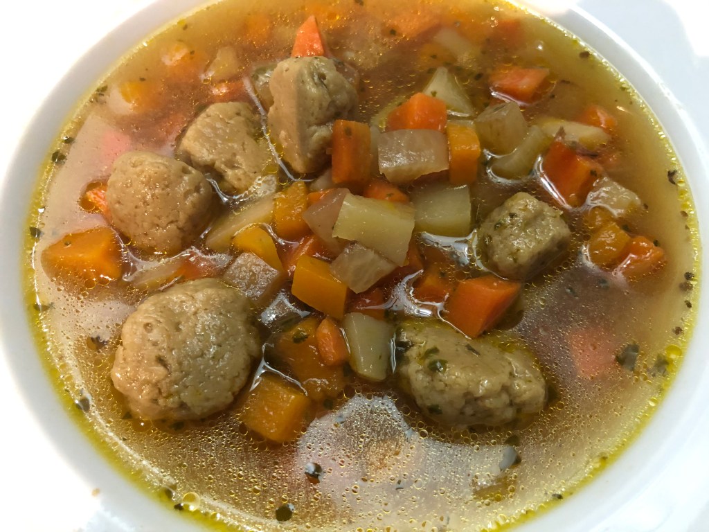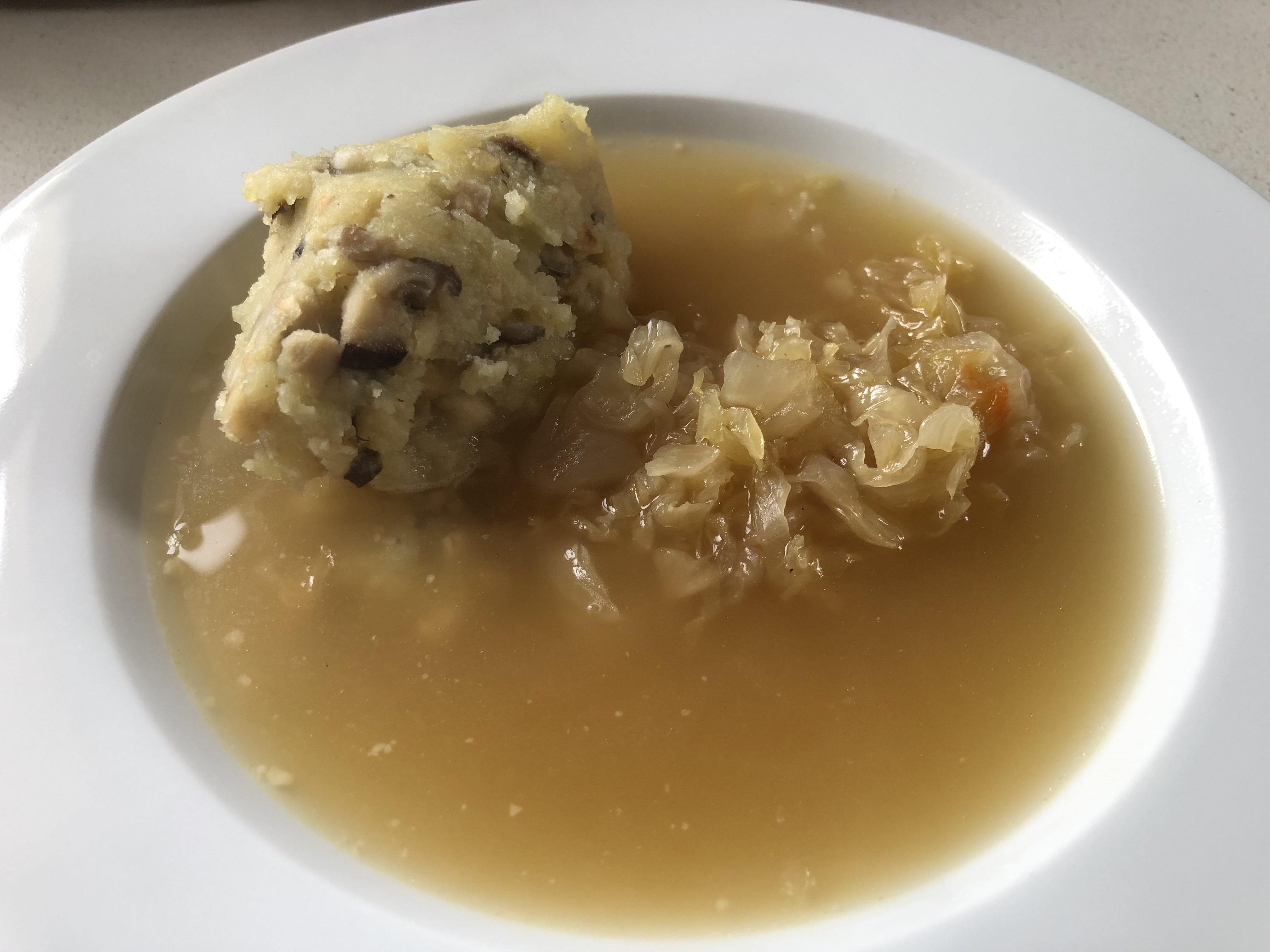 This is a vegan version of a traditional recipe that I had in a little Polish restaurant in Doncaster. The soup was a thin clear broth with sauerkraut in it, and on the side of the dish a pile of mashed potatoes that you mixed into the soup as you ate it to thicken it.