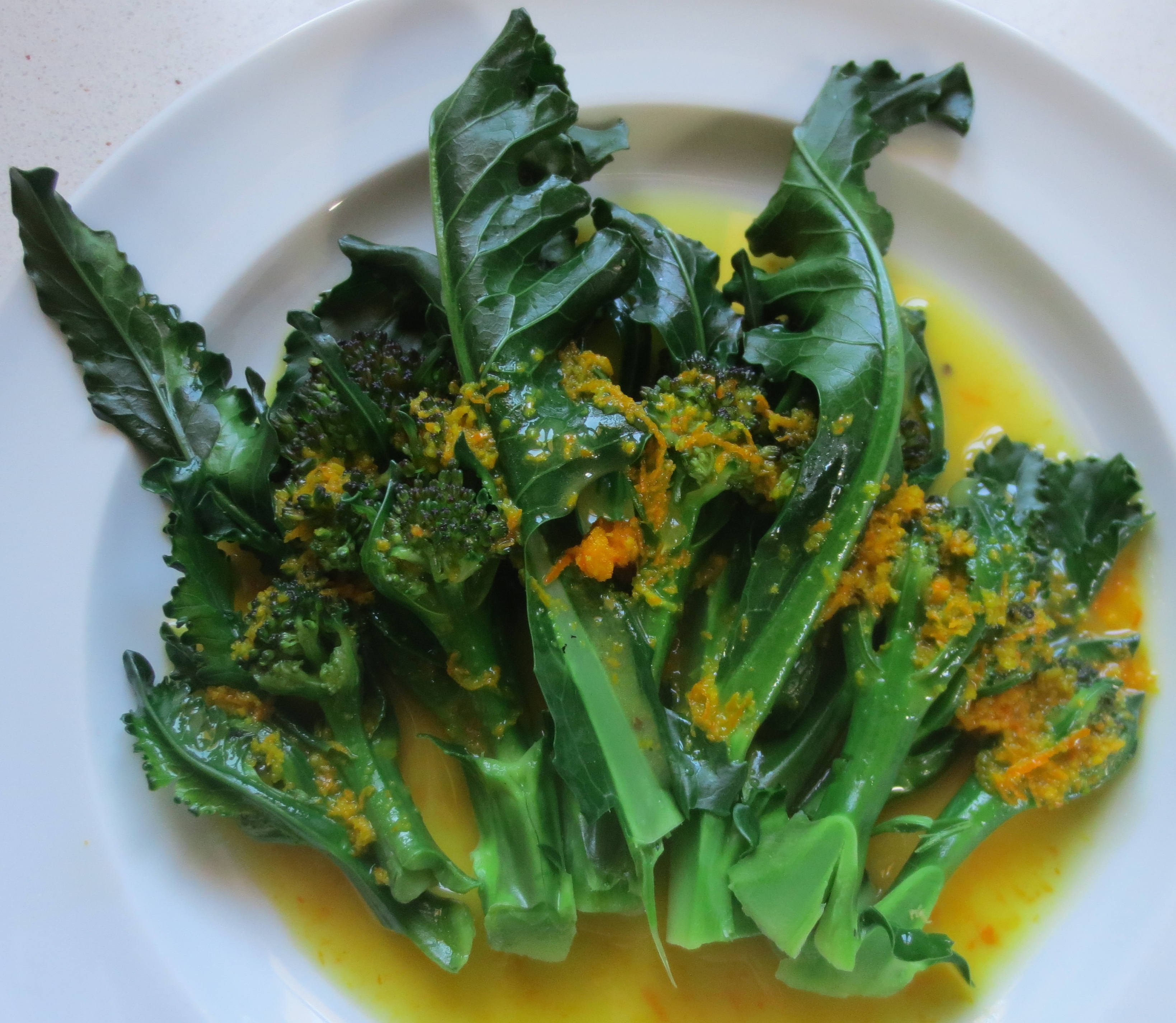 Just starting to be ready are the asparagus and purple sprouting broccoli. The very first head of broccoli this season, I had with orange butter as a starter, absolutely delicious. Butter sauces are a little out of favour at the moment with the concerns with cholesterol and saturated fats, but I would rather have the occasional bit of real butter than weird tasting margarines made with emulsifiers and who knows what base oil. You can of course use green broccoli for this or the green Romanesco cauliflower, white cauliflower I think is too bland for this sauce. Asparagus, either green or white are both complemented well the flavour of the orange butter.