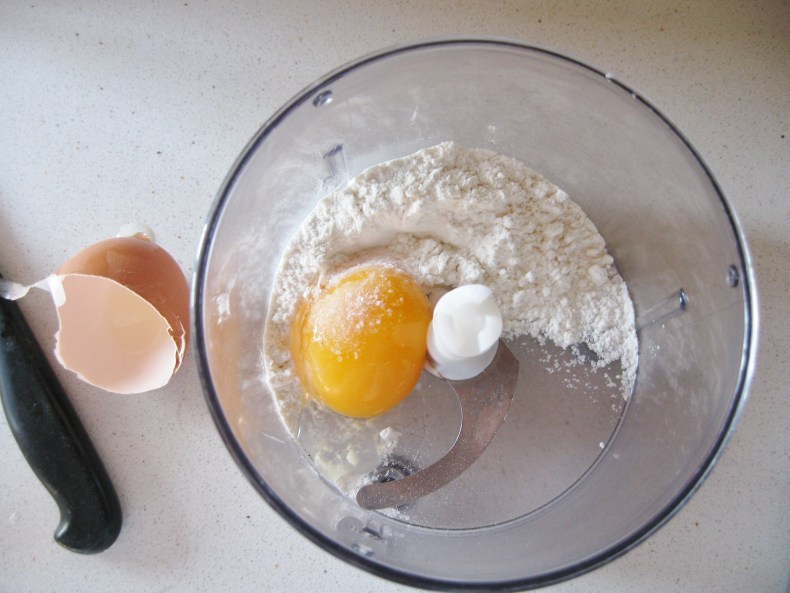 If you are using a mini food processor simply put all the ingredients in it and process to a dough. If the dough is very stiff and dry and is not holding together, add a teaspoon of the egg white and pulse. If the dough is still very dry you may have to repeat this operation. The reason that the dough is sometimes the wrong texture is that different flours absorb different amounts of liquid, and of course there is slight variation in the size of a large egg yolk.