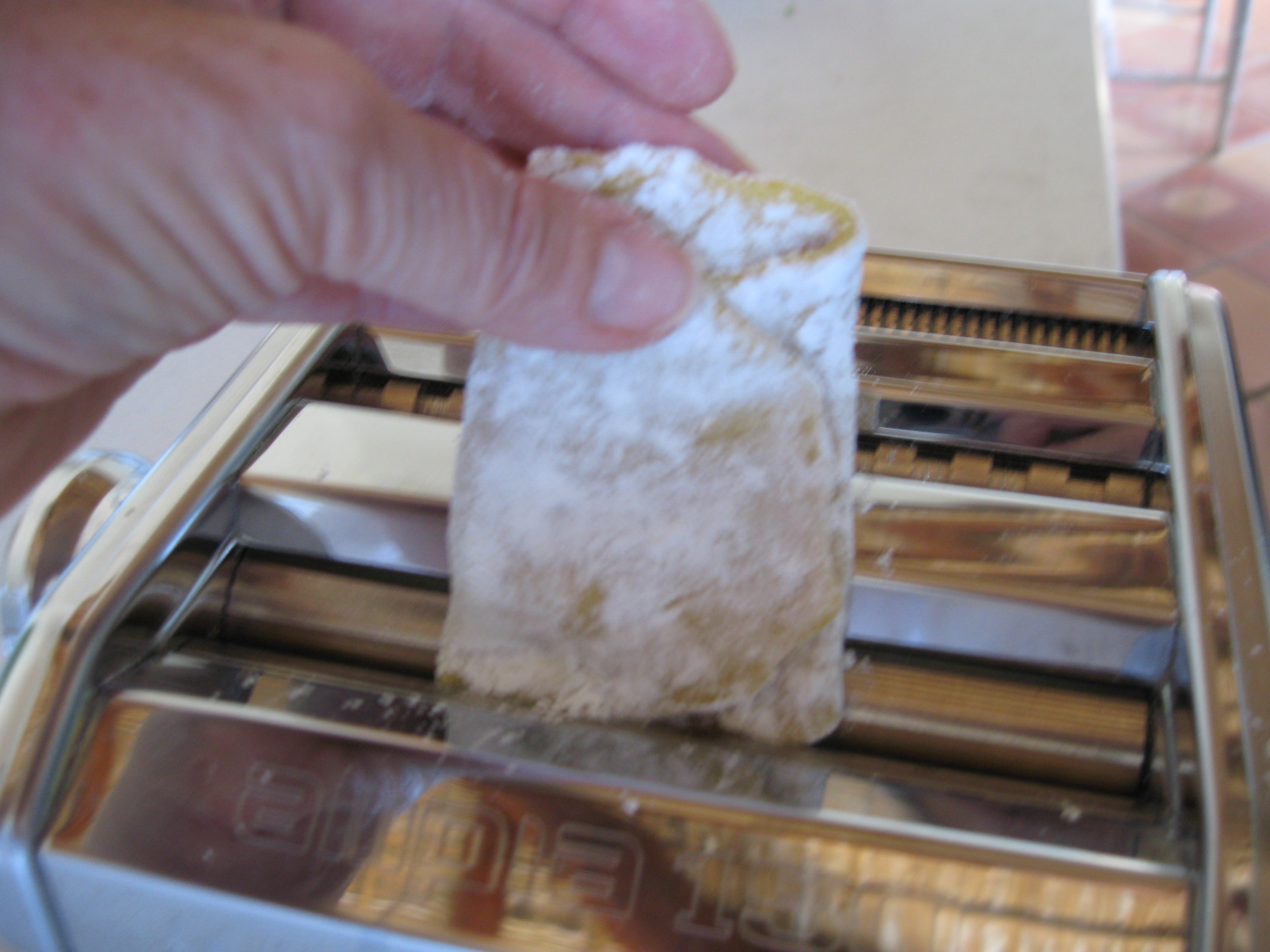 Move the setting of the distance between the rollers one number closer. Roll the dough, lightly dust with flour. Then move one more number and roll again, lightly dust with flour again. Keep moving one setting at a time until the dough is quite thin, number 7 or 8 on my machine. As the strip of pasta gets longer, do cut it into more manageable lengths.