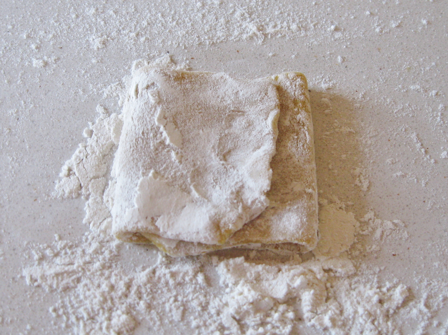 Keep repeating this rolling and folding until the pasta is paler and silkier. With this type of pasta it is between 8 and 10 rollings. If the pasta starts to get crumbly and breaks up a bit, stop the folding and rolling and move on to the next stage.