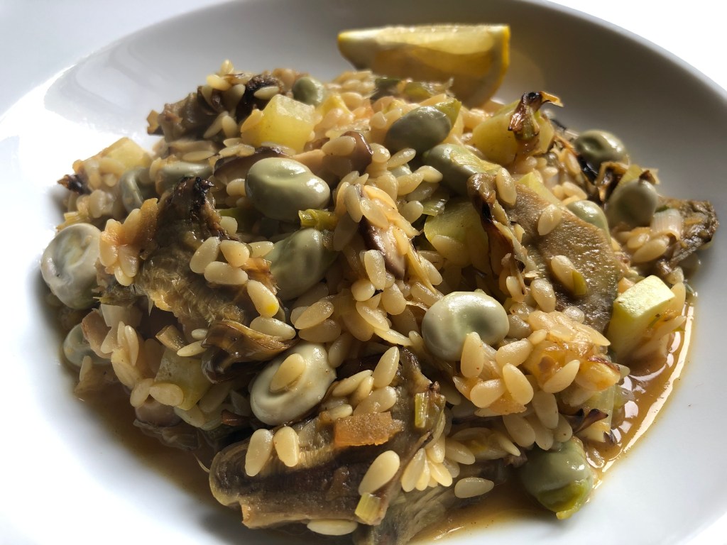 The fresh broad beans from my huerta or vegetable garden are sweet and tender, perfect for this dish.