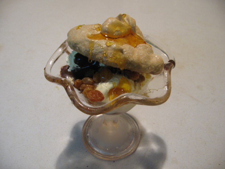 Vanilla ice cream, raisins soaked in rum, bitter chocolate sauce topped with a coffee meringue and maple syrup. This turned out to be an absolute wow with my guests. Remember to put your sundae dishes in the freezer to chill them down at least two hours before they will be needed. They look so pretty with the frosting of condensation on the cool glass and help keep the sundae from melting before it gets to your guests.